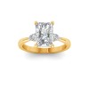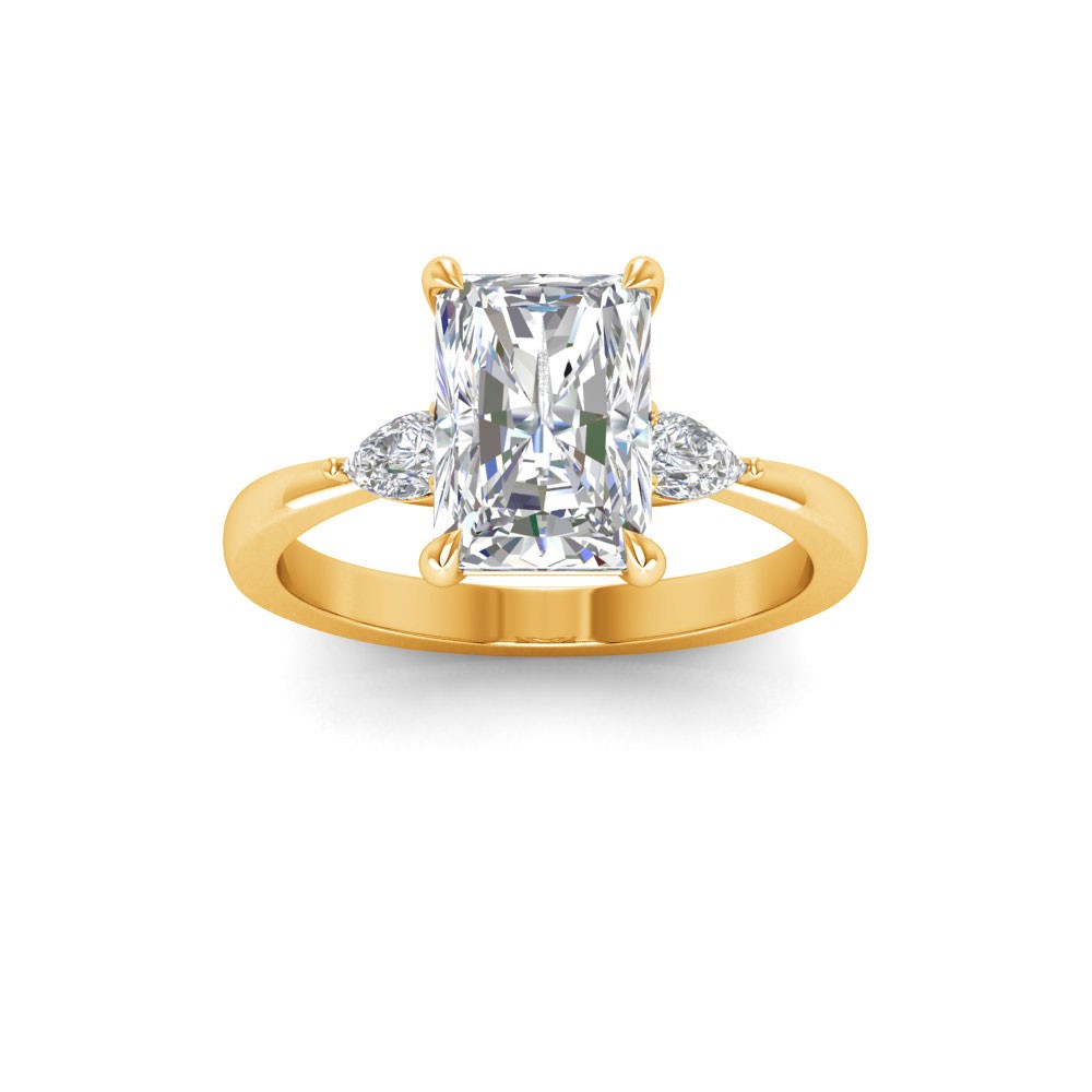 A clean and timeless three-stone design featuring a 2.5-carat radiant-cut center stone. Tapered pear-shaped lab-created diamonds (0.40 ctw) sit on each side, set on a thin band that subtly narrows toward the accents for a balanced, sophisticated look.