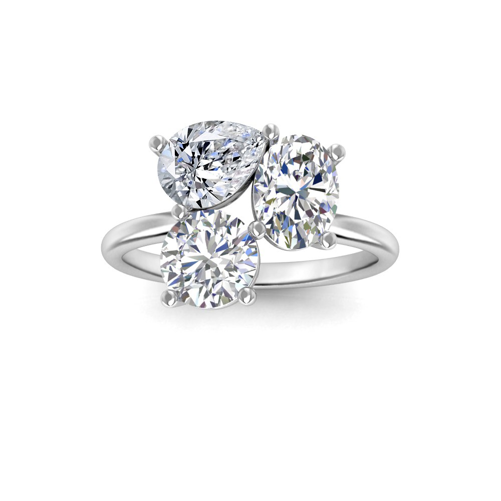 An IGI certificate is included with all Twobirch Lab Diamonds Setting: Three Stone Stone Type: Lab Diamond Stone Count: 3 Ring Width: 2 mm Total Carat Weight: 3 CTW Single Stone Carat Weight: 1 CT Clarity & Color: min G-H / SI1 Stone 1 Shape: Round Measurements: 6.5 mm Stone 2 Shape: Oval Measurements: 7 x 5 mm Stone 3 Shape: Pear Measurements: 8 x 5 mm